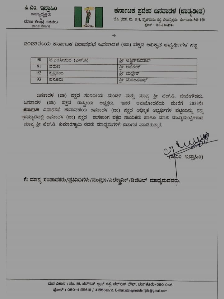 ಬೆಂಗಳೂರು: ರಾಜ್ಯದ 93 ವಿಧಾನಸಭಾ ಕ್ಷೇತ್ರಗಳಿಗೆ ಜೆಡಿಎಸ್ ಅಭ್ಯರ್ಥಿಗಳ ಪಟ್ಟಿಯನ್ನು ಜೆಡಿಎಸ್ ರಾಜ್ಯಾಧ್ಯಕ್ಷ ಸಿ.ಎಂ..ಇಬ್ರಾಹಿಂ ಬಿಡುಗಡೆ ಮಾಡಿದ್ದಾರೆ.