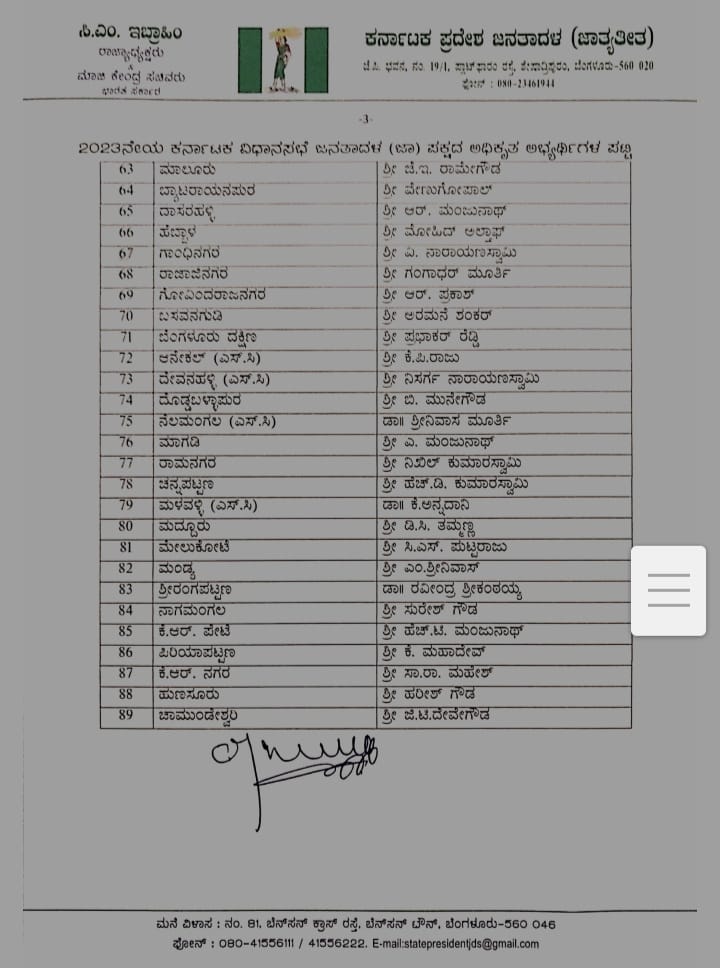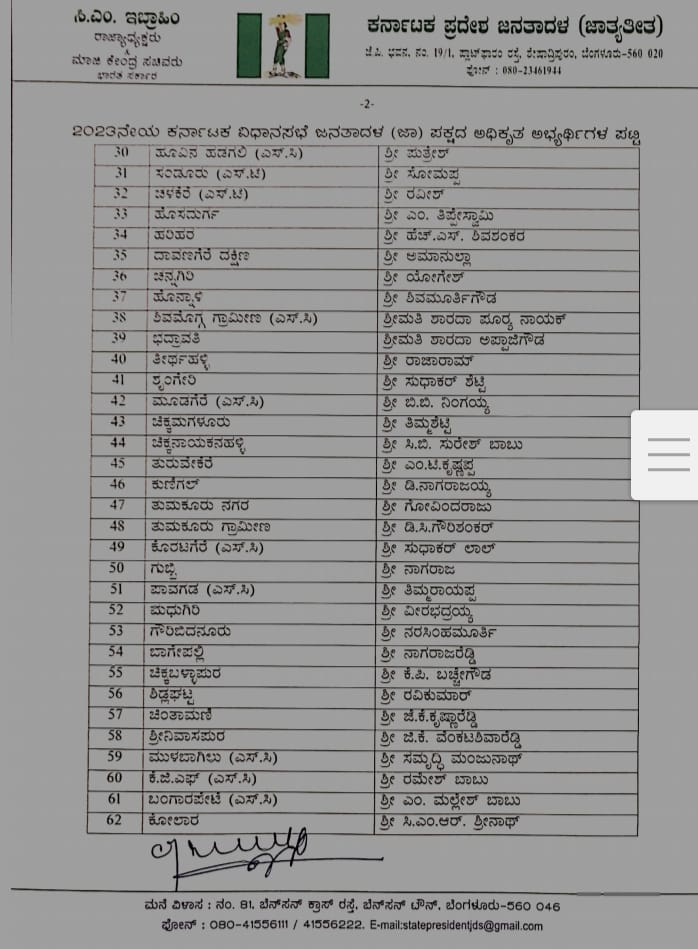 ರಾಮನಗರ ಜಿಲ್ಲೆಯಲ್ಲಿ ನಡೆದ ಪಂಚರತ್ನ ಸಮಾವೇಶದಲ್ಲಿ ಕುಮಾರಸ್ವಾಮಿ ಅವರು ಸೋಮವಾರ ಜೆಡಿಎಸ್ ಮೊದಲ ಪಟ್ಟಿ ಬಿಡುಗಡೆ ಮಾಡಲಾಗುವುದು ಎಂದು ತಿಳಿಸಿದ್ದರು. ಅದರಂತೆ ಪಕ್ಷದ ರಾಜ್ಯಾಧ್ಯಕ್ಷ‌ ಸಿ.ಎಂ. ಇಬ್ರಾಹಿಂ ಮೊದಲ ಪಟ್ಟಿ ಬಿಡುಗಡೆ ಮಾಡಿದ್ದಾರೆ.