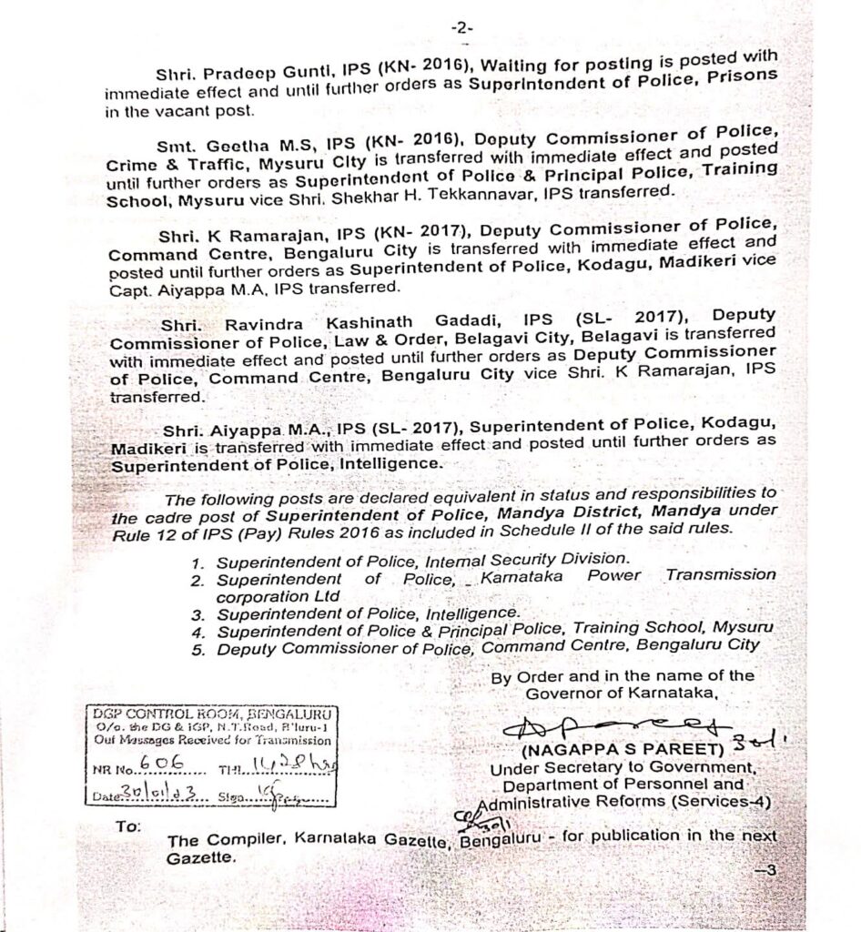 ಸ್ಥಳ ನಿರೀಕ್ಷೆಯಲ್ಲಿದ್ದ ಪ್ರದೀಪ ಗುಂಟಿ ಅವರನ್ನು ಕಾರಾಗೃಹ ಇಲಾಖೆ, ಮೈಸೂರು ಡಿಸಿಪಿ ಗೀತಾ ಎಂ.ಎಸ್. ಅವರನ್ನು ಮೈಸೂರು ತರಬೇತಿ ಶಾಲೆಗೆ, ಬೆಂಗಳೂರು ಸೆಂಟ್ರಲ್ ಡಿಸಿಪಿ ಕೆ. ರಾಮರಾಜನ್ ಅವರನ್ನು ಕೊಡಗು ಎಸ್ಪಿಯಾಗಿ, ಬೆಳಗಾವಿ ಡಿಸಿಪಿ ರವೀಂದ್ರ ಗಡಾದಿ ಅವರನ್ನು ಬೆಂಗಳೂರು ಸೆಂಟ್ರಲ್ ಡಿಸಿಪಿ ಹಾಗೂ ಕೊಡಗು ಎಸ್ಪಿ ಅಯ್ಯಪ್ಪ ಎಂ.ಎ. ಅವರನ್ನು ಗುಪ್ತಚರ ಇಲಾಖೆಗೆ ವರ್ಗಾವಣೆಗೊಳಿಸಲಾಗಿದೆ.